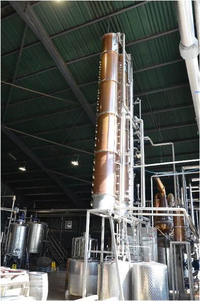 蒸溜しているのは、モルト・ウイスキー、ライ・ウイスキー、ジン用の小麦のニュートラル・スピリッツ、エンドウ豆のニュートラル・スピリッツ、ポテト・ウオツカ用のポテトのニュートラル・スピリッツである。多様な蒸溜酒の生産に対応できるように、仕込みはモルト・ウイスキー用のマッシュ・タン、スピリッツ用のクッカー(蒸煮器)とマッシュの温度調整槽がある。蒸溜設備は全て単式蒸溜であるが、ポット・スティルと精溜塔(Rectifying column)の組み合わせが使われている。年間の製造能力は製造品目の組み合わせにもよるが、合わせて100%アルコール換算で最大約300kl(筆者推定)である。大型蒸溜所に見られるコンピュータ制御はなく、ほぼ手動である。製造設備は全てドイツのCarl社製である。