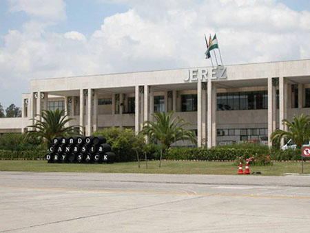 ヘレス空港:空港に着くと、明るい空と太陽の光、南国の椰子の木と、樽のディスプレーがシェリーの郷にきた事を実感させてくれる。