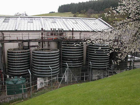 モートラッハ蒸溜所:ダフタウンで最も古い蒸溜所。ウィリアム・グラントは独立してグレンフィディック蒸溜所を建設する以前、この蒸溜所で20年間働いた。写真の円形のタンクには蒸溜釜から出たウイスキーの蒸気を冷却するワーム(蛇管)が水に浸漬してある。訪問したのは5月始めだったが、ちょうど桜の季節だった。