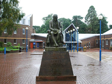 ジェームス・ワット像とヘリオット-ワット大学正面前の広場:1973年から大学は順次このリッカートンにある新キャンパスに移転した。近代的なキャンパス内には学生が生活できる環境 ― 宿舎、食堂、パブ、銀行、スーパーから散髪屋まで整っている。